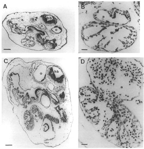 and C, the internal structure and, in B and D, the heart of partial and normal stage 42 larvae, respectively, hb, hind brain;