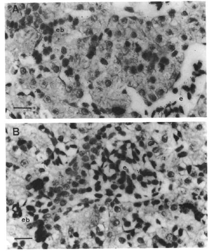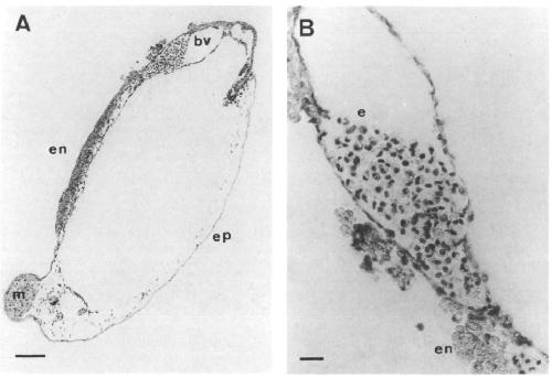 ep, epidermis; en, endoderm; m, muscle cells; bv, blood vessel; e, erythrocytes. Bar in A=100um, in B=20um.