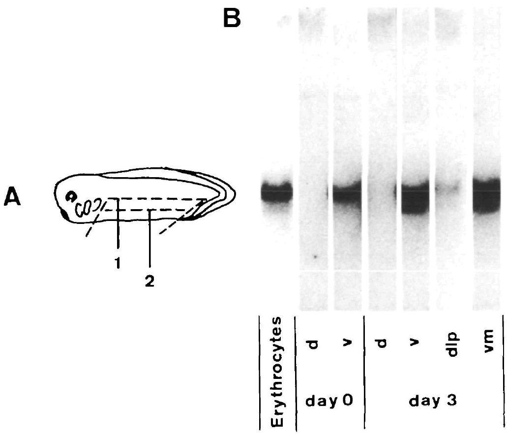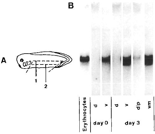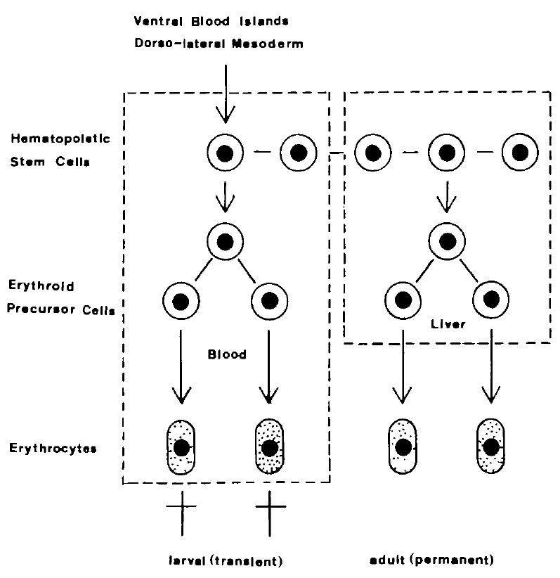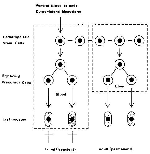 The transition of hemoglobins during metamorphosis of Xenopus laevis involves replacement of the larval erythrocytes by adult ones, suggesting that the developmental control of this event depends upon the growth characteristics of the precursor cells. To identify the erythroid precursor cells and to investigate their developmental fate, we analyzed the distribution of stage-specific globin mRNAs by northern blotting in dorsal and ventral fragments of stage 32 embryos after in vitro culture as well as presumptive erythropoietic tissues of tadpoles during metamorphosis. The histological analysis shows that erythrocytes differentiate only in ventral fragments, suggesting that the ventralblood islands and most likely also the dorsolateral mesoderm are the primary sites of erythropoiesis. We also demonstrate that the first generations of erythrocytes, already express the predominating larval-specific alpha-globin mRNAs. The globin mRNA patterns obtained from presumptive erythropoietic tissues suggest an important role of circulating precursor cells in larval erythropoiesis, whereas the liver appears to be the main site of formation and maturation of the adult erythrocytes. Tentatively we propose that anuran erythropoiesis is dependent upon a self-perpetuating stem-cell line and that the larval and the adult erythrocytes are derived from successive generations of erythroid precursors, whose commitment may be imposed by the erythropoietic sites.