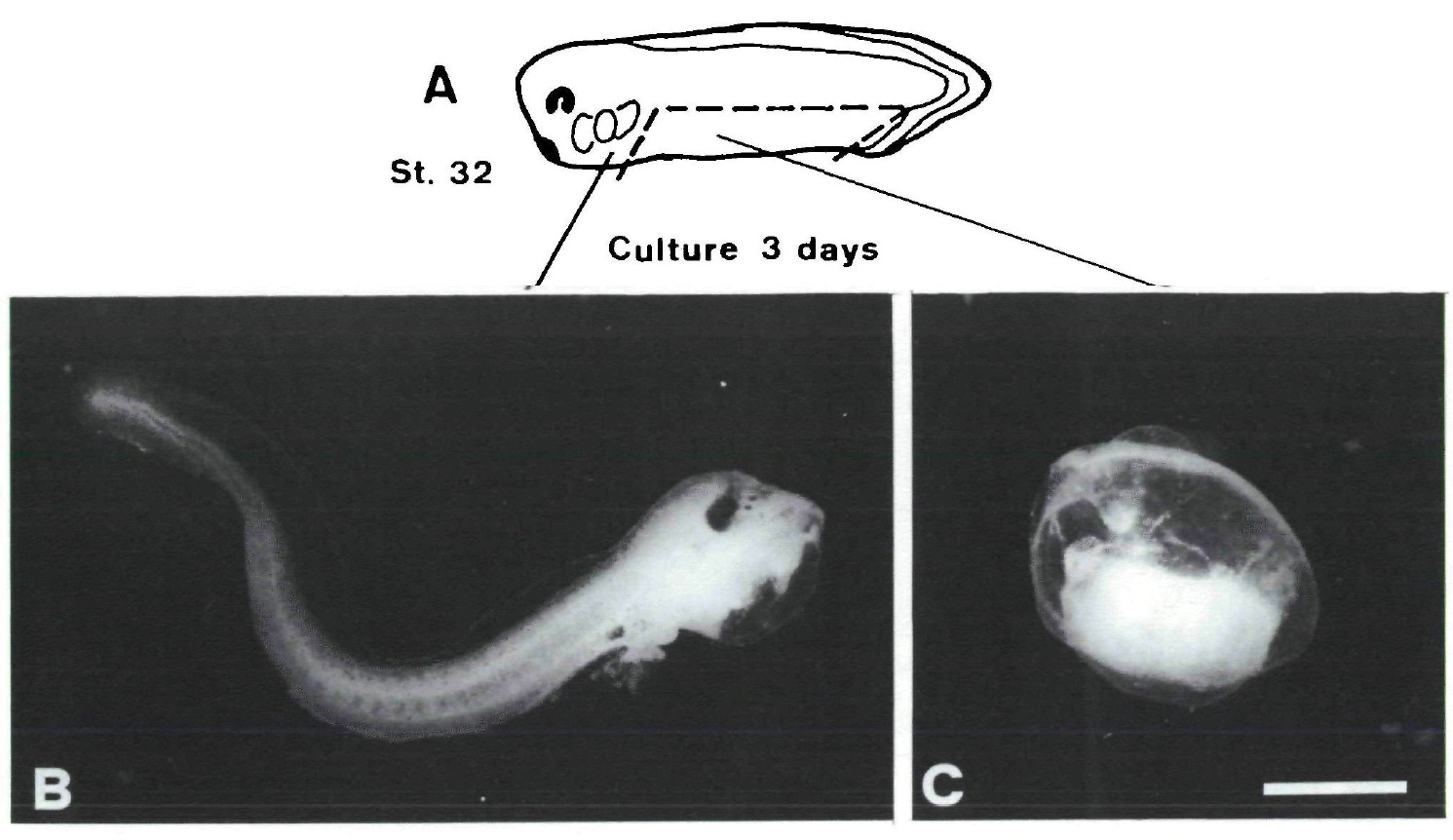 Fig. 1. In vitro culture of embryonic fragments. (A) Dissection of Xenopus embryos into dorsal and ventral fragments.