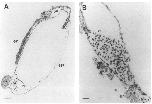 Fig. 3. Internal structure of vesicle obtained from a ventral fragment. Overall view of section in A and blood vessel in B.