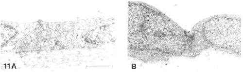 Fig. 11. T.E.M. sections showing (A) a portion of the squamous epithelium near the base of an axial protrusion, and (B) a