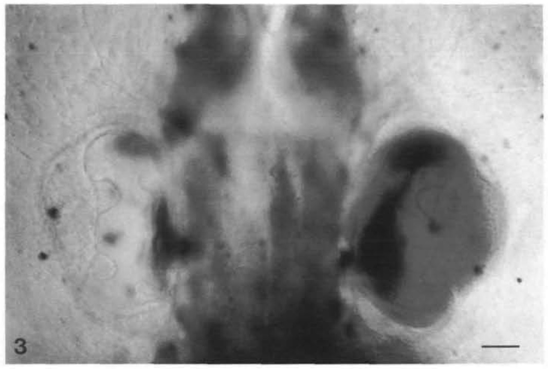 Fig. 3. Dorsal view of an intact tadpole at stage 46, showing the location of the ears adjacent to the hindbrain. A blue