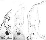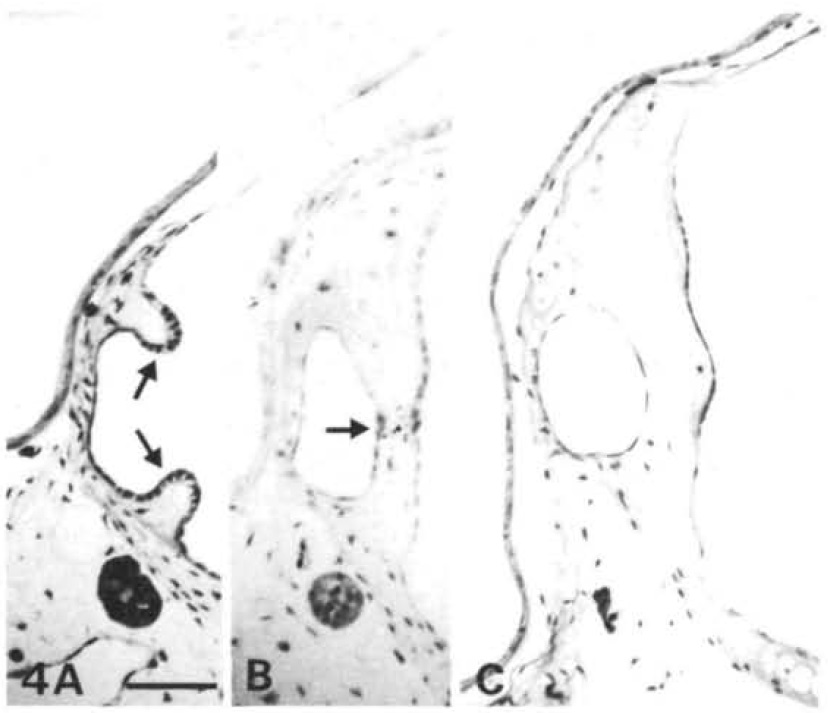 portion of the rather thicker epithelium covering the tip of the same protrusion. In (A) one can see a well-defined basal