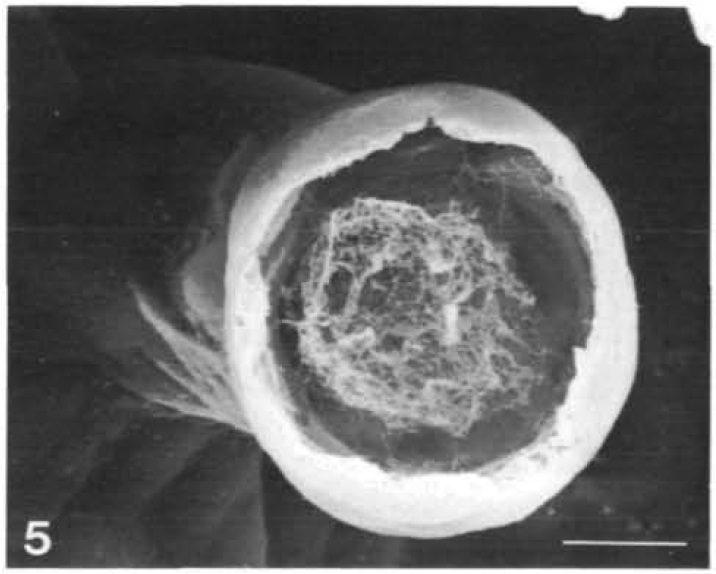 Note the finely fibrous matrix in the core. Scale