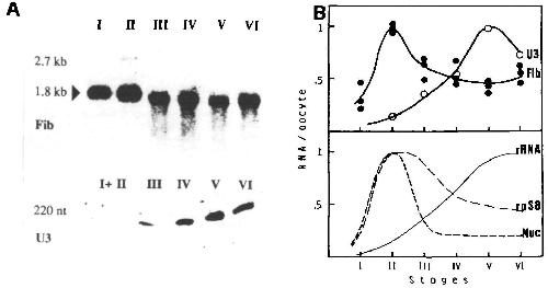 Fig. 1. Fibrillarin mRNA and U3 snRNA accumulation during oogenesis. (A) Northern blot. Fib - Total RNA equivalent to one oocyte was separated by electrophoresis in a denaturing-formaldehyde 1 % agarose gel, electrotransferred to a nitrocellulose filter and hybridized under stringent conditions with a nick-translated Xenopus fibrillarin cDNA as a probe. The slight variations of electrophoretic mobility are due to the large amount of rRNA after stage II. U3 - Total RNA equivalent to five oocytes was separated by electrophoresis in a denaturing 7 M urea-5% polyacrylamide gel, electrotransferred on a nylon filter and hybridized under stringent conditions with a 3' labeled 22-mer synthetic oligonucleotide complementary to U3 snRNA (nt 101-122) U3 snRNA was identified using CHO 32P RNA as markers. The 'smile' of the gel is artefactual. (B) Quantitative data. Relative expression of fibrillarin mRNA, U3 snRNA, S8 rp-mRNA and rRNA during oogenesis. Upper panel: values, obtained by densitometric quantitation of the experiment shown in A and of others, are expressed relative to the highest point. Fibrillarin mRNA ( ⢠â¢); U3 snRNA (O O) Lower panel already published curves for rRNA (solid line), r-protein S8 mRNA (long broken lines); nucleolin mRNA (short broken lines).