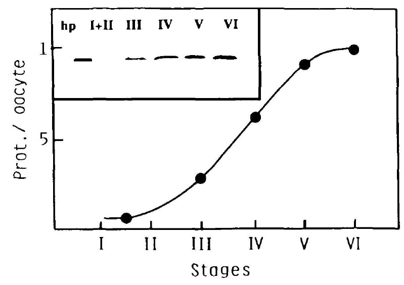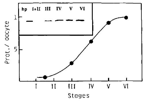 Fig. 2. Expression of fibrillarin antigen during oogenesis Total protein extracts from ten defolliculated oocytes were prepared as descnbed in Materials and methods. Proteins corresponding to five oocytes were run in each lane of a 12 % SDS-PAGE. The gel was blotted onto nitrocellulose and probed with anti-fibrillarin serum. Detection of the complexes was achieved by a second antiserum coupled to alkaline phosphatase The insert shows a typical western blot, hp, hepatocyte nuclei; I to VI oocyte stages according to Dumont (1972). The graph shows quantitative data obtained by densitometnc scanning of the western blots of different experiments.