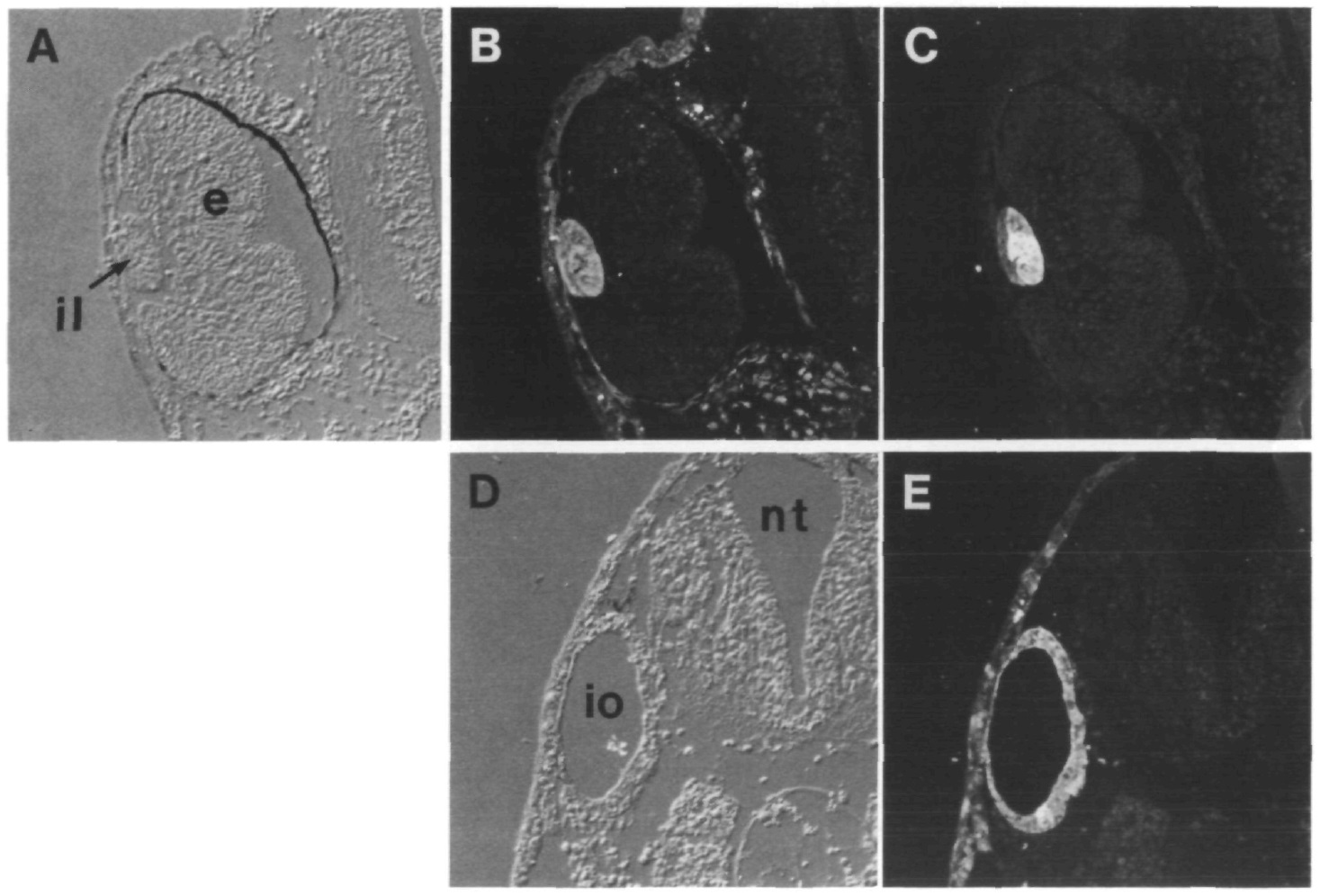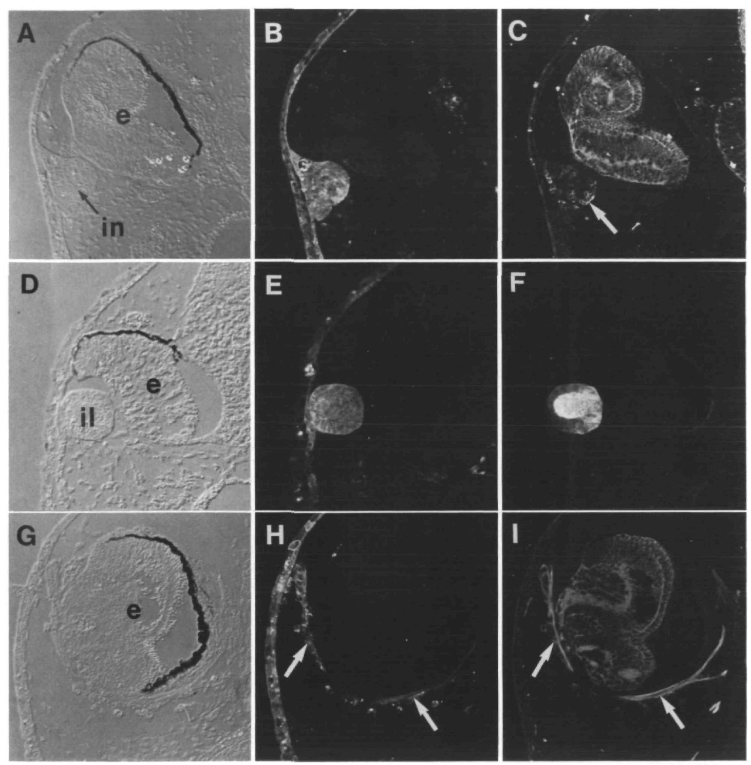 antibody; F stained with anti-lens protein antibody). Abbreviations, e, eye; in, induced neural tissue; il, induced