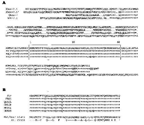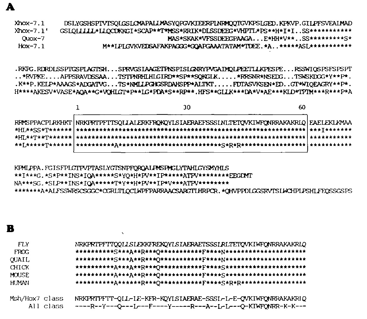 Fig. 1. (A) Comparison of the deduced amino acid sequences of Xhox-7.1, Xhox-7.1', Quox-7 and Hox-7.1 (Hill et al.