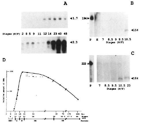 and bottom respectively. Total RNA samples (10 fig in each track) are from embryos of stages 2 to 48. (N/F) denotes the