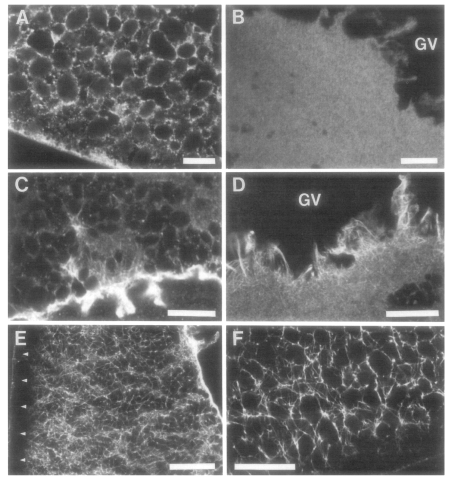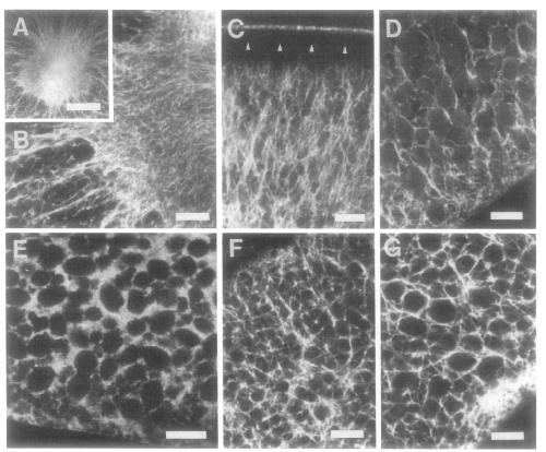 microtuhule network is interspersed with the large yolk platelets of the vegetal hemisphere (60X ohj; bar is 25 pm). (F) A tangential section of