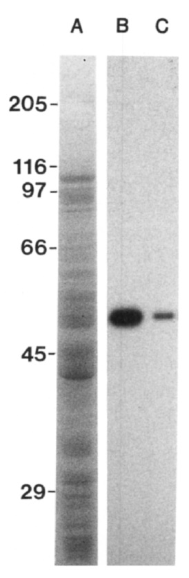 tubulin. (Lane A) SDS-PAGE of 35 pg of soluble cytoplasmic protein
