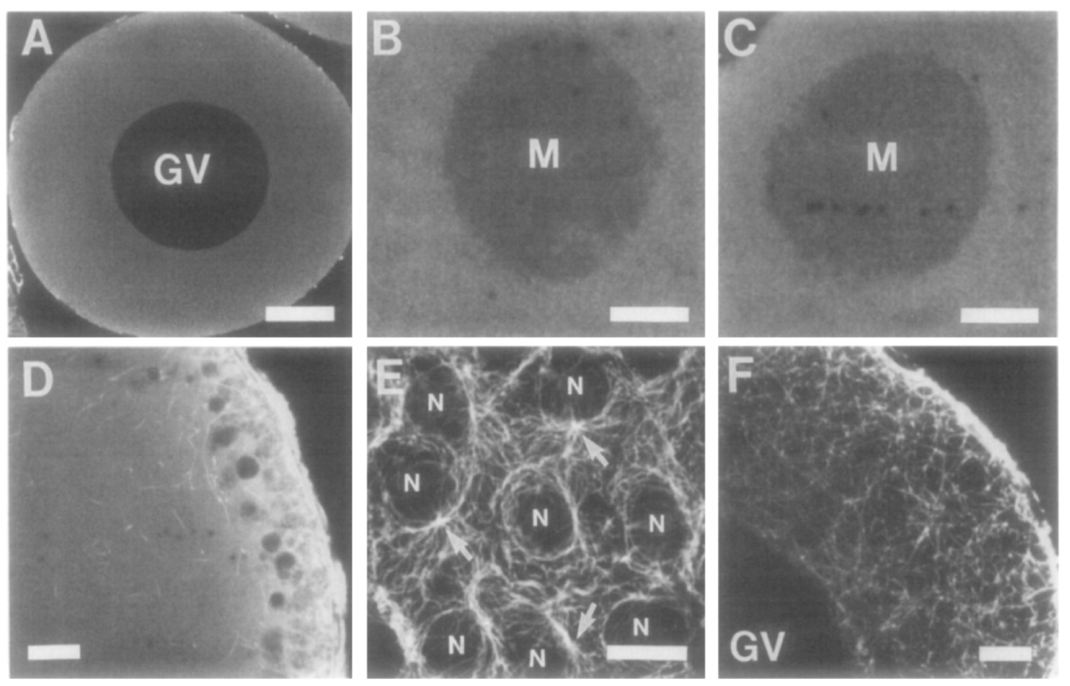 hemisphere of this enucleatcd oocyte (60X obj; bar is 12.5 nm). (D) A less ordered microtubule array in the vegetal hemisphere of an enucleated