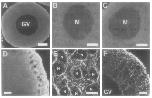 symmetrically located GV, a brightly stained cortex, and a fibrous array extending between (10X obj; bar is 100 pm). (C) Closer examination of