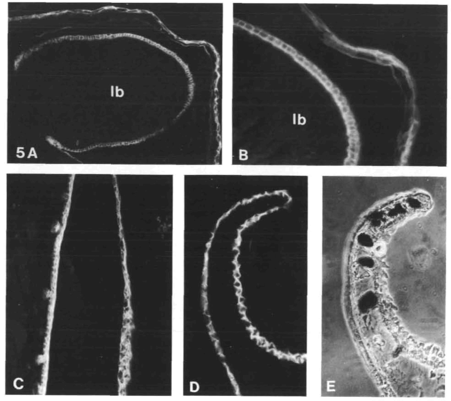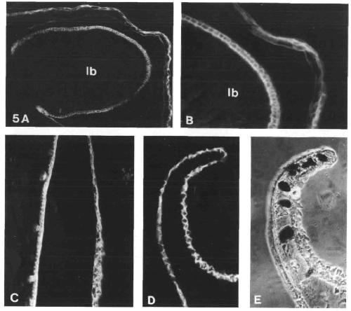 E-cadherin-positive. lb, limb bud. Magnification: A, x75; C, xlOO; B,D,E, x!50.