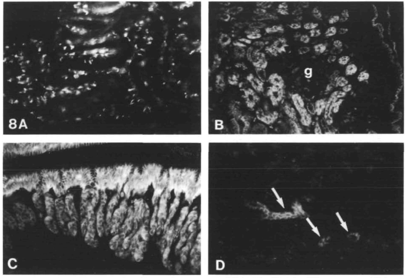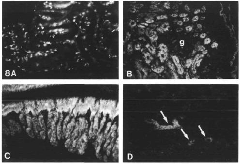 epithelium (arrows) is much more strongly stained than the hepatocytes. (g) glomerulus. Magnification: xlOO.