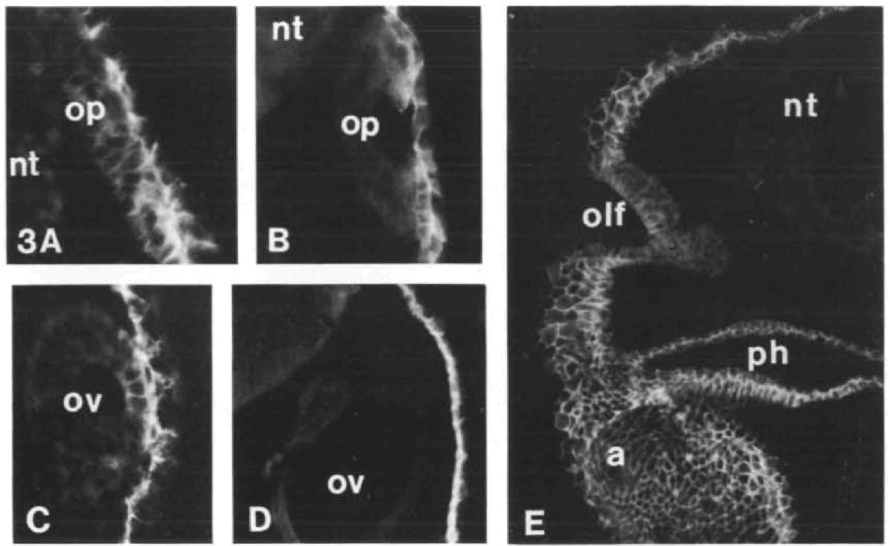 placode stage 37 (E); E-cadherin immunoreactivity diminishes sharply in the olfactory cells, a, cement gland; olf, olfactory