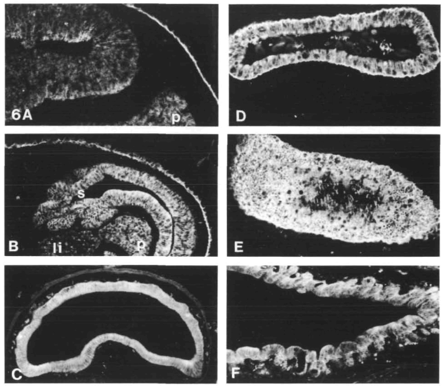 A vast amount of experimental evidence suggests that cell surface molecules involved in cell-to-cell and/or cell-to-substrate interactions participate in the control of basic events in morphogenesis. E-cadherin is a cell adhesion molecule directly implicated in the control of Ca2(+)-dependent interactions between epithelial cells. We report here the patterns of expression of E-cadherin in developmental stages of Xenopus laevis ranging from early embryo to adult using immunofluorescence microscopy. Although its distribution shares some similarities with those of L-CAM in the chicken and E-cadherin/Uvomorulin in the mouse, the distribution of E-cadherin in Xenopus presents several peculiar and unique features. In early stages of Xenopus development, E-cadherin is not expressed. The molecule is first detectable in the ectoderm of late gastrulas (stage 13-13.5 NF). At this time both the external and the sensory layer of the nonneural ectoderm accumulate high levels of E-cadherin while the ectoderm overlying the neural plate and regions of the involuting marginal zone (IMZ) not yet internalized by the movements of gastrulation are E-cadherin-negative. Unlike most other species, endodermal cells express no or very low levels of E-cadherin up to stage 20 NF. Endodermal cells become strongly E-cadherin-positive only when a well-differentiated epithelium forms in the gut. No mesodermal structures are stained during early development. In the placodes, in contrast to other species, E-cadherin disappears very rapidly after placode thickening. During further embryonic development E-cadherin is present in the skin, the gut epithelium, the pancreas, many monostratified epithelia and most glands. Hepatocytes are stained weakly while most other tissues, including the pronephros, are negative. In the mesonephros, the Wolffian duct and some tubules are positive. During metamorphosis a profound restructuring of the body plan takes place under the control of thyroid hormones, which involves the degeneration and subsequent regeneration of several tissues such as the skin and the gut. All newly formed epithelia express high levels of E-cadherin. Surprisingly, degenerating epithelia of both skin and intestine maintain high levels of the protein even after starting to become disorganized and to degenerate. In the adult, staining is strong in the skin, the glands, the lungs, the gut epithelium and the pancreas, weak in the liver and absent from most other tissues. Our results show that the expression of E-cadherin in Xenopus is strongly correlated with the appearance of differentiated epithelia.
