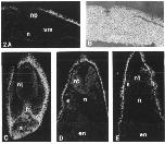 different levels of a stage 23 embryo; C is the most rostral section and E is the most caudal, a, cement gland; en