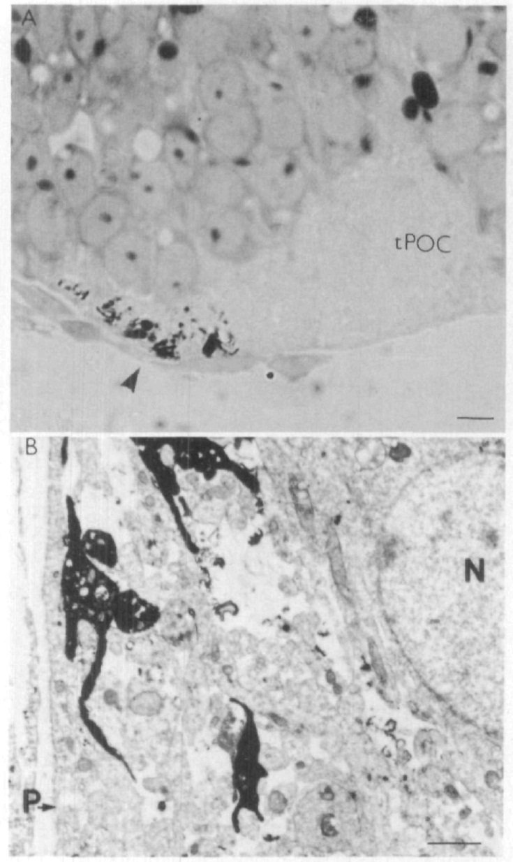 (B) Electronmicrograph of HRP-labelled retinal axons and