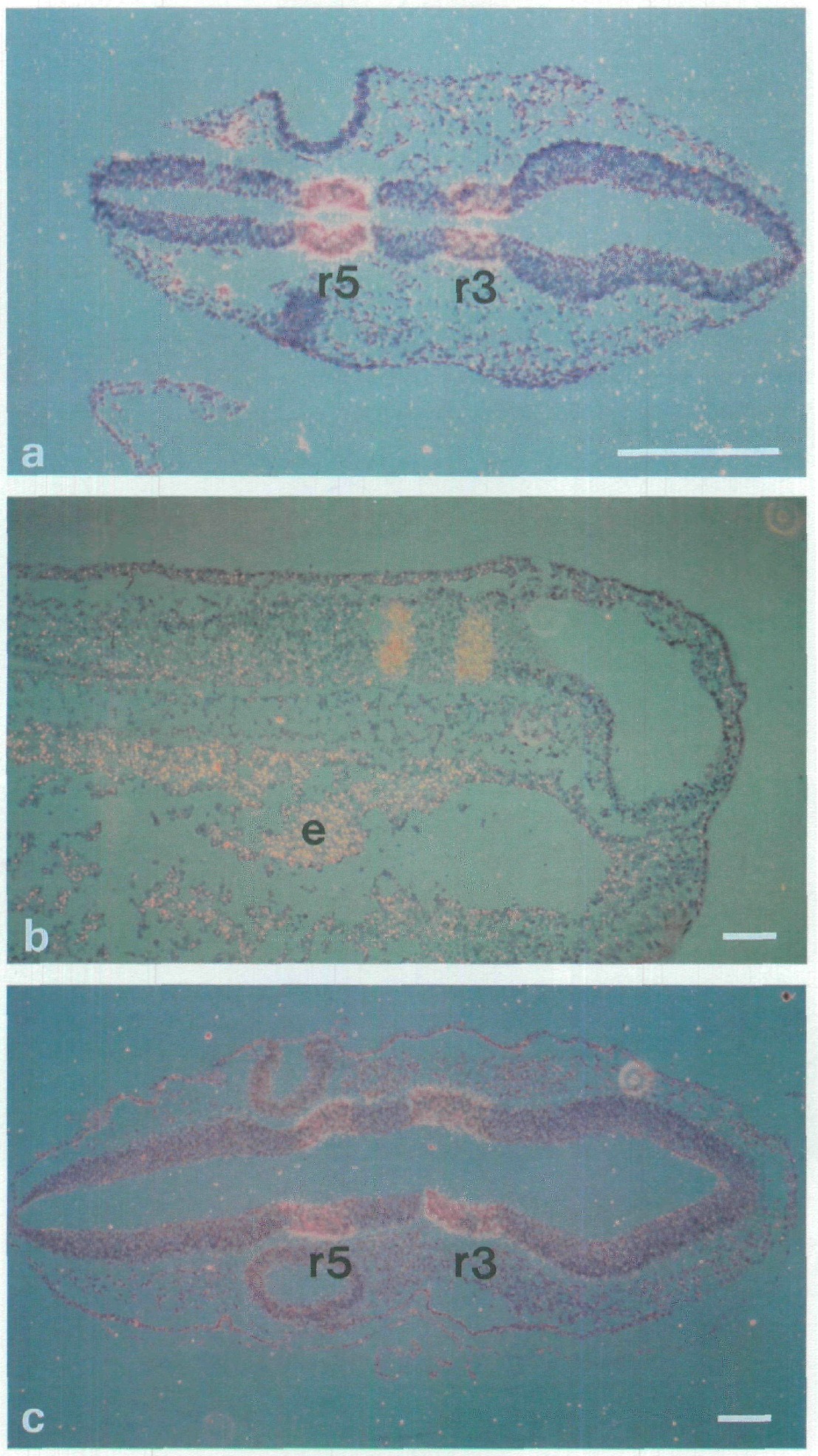 Fig. 3. Onset of Krox-20 expression in the mouse and chick embryo. In situ hybridisation analysis was carried out to