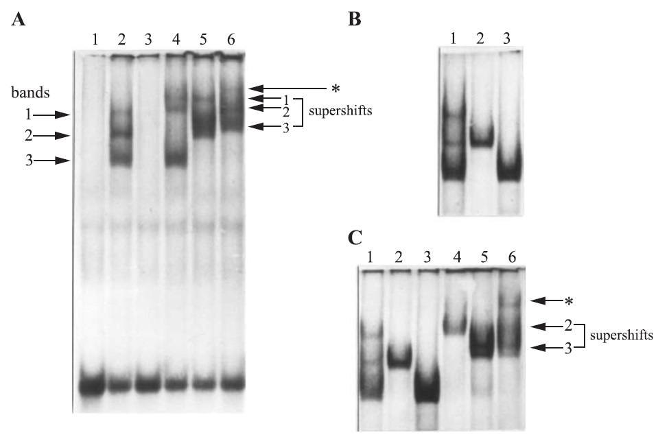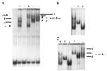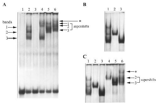 were electrophoresed on 3.5% native polyacrylamide gel. In A and B, end-labeled wild-type probes ( 73 to 43) were used. (A) Lane 1, probe alone; 2, probe