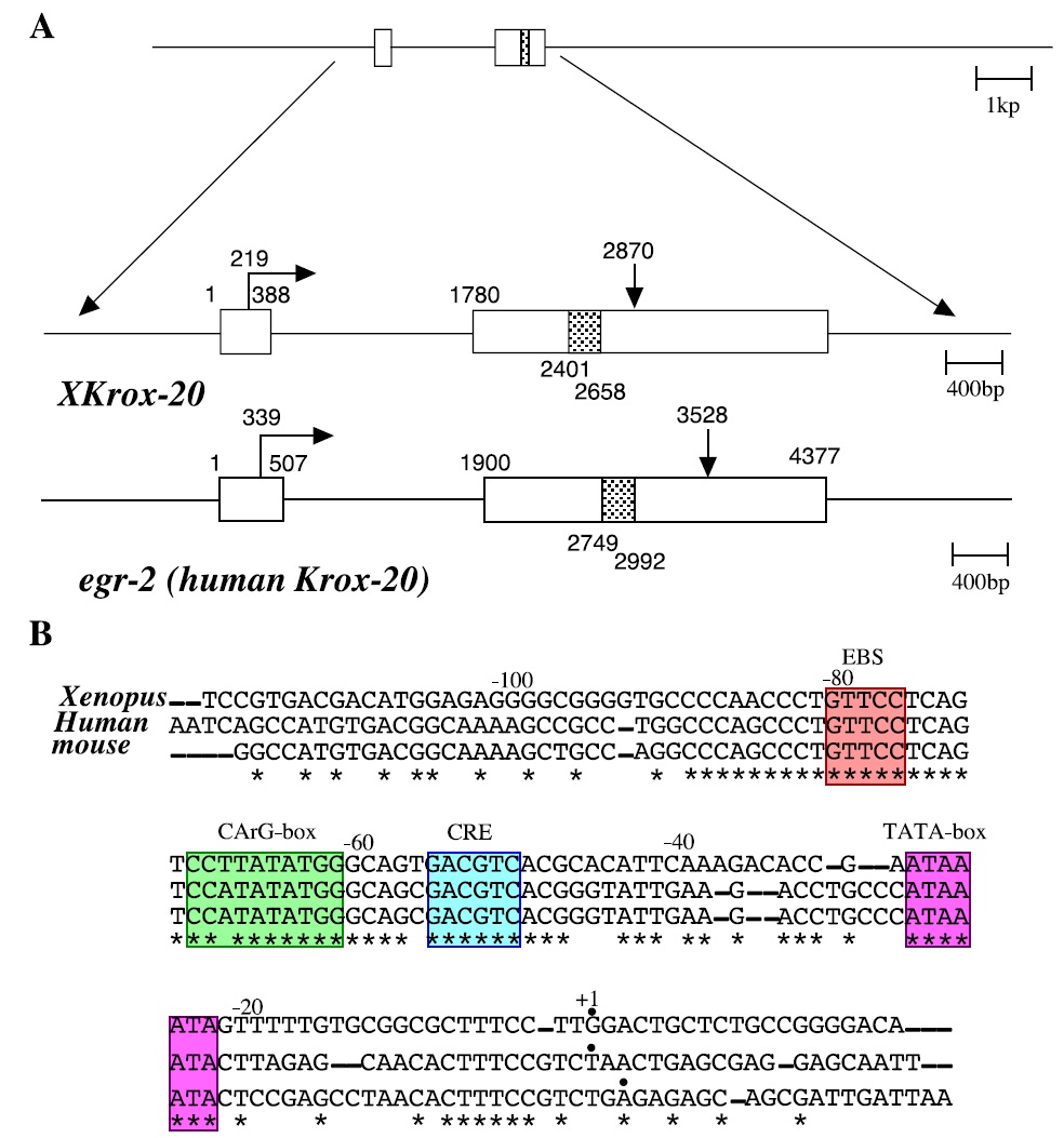 Fig. 1. Structural analysis of the Xenopus Krox-20 gene and comparison with human and mouse Krox-20 genes. (A) Schematic illustration of the XKrox-20