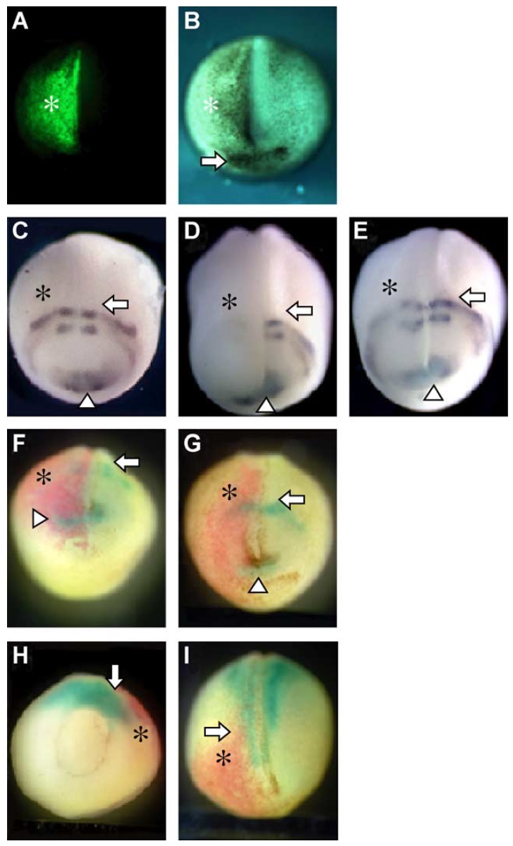 GFP mRNAs were coinjected as in D and double in situ hybridization was