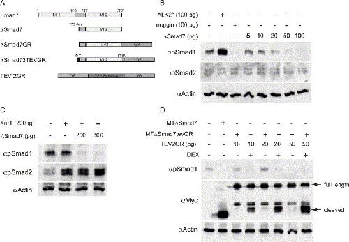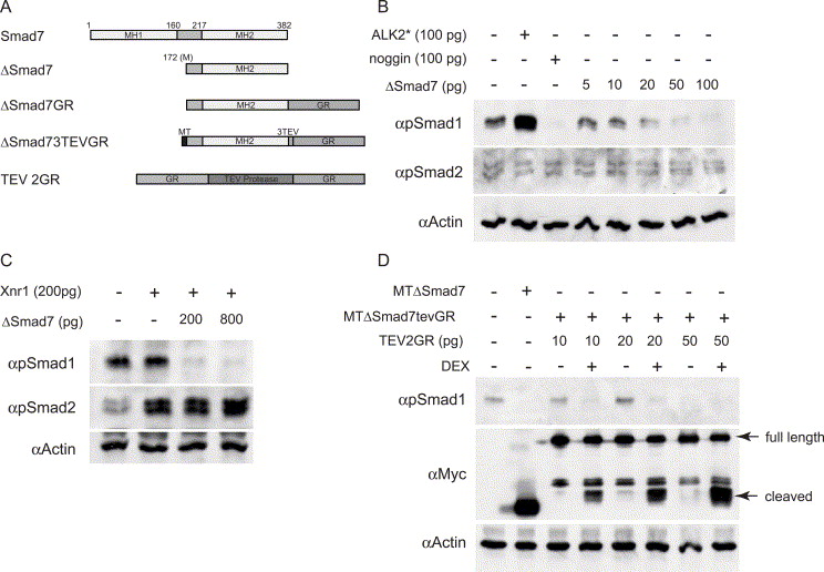 Fig. 1. δSmad73TEVGR is an inducible inhibitor of Smad1 phosphorylation. (A) Diagram of inducible inhibitor constructs. δSmad7 is a deletion of the MH1 domain of Xenopus Smad7, using the methionine at amino acid 172 as a start codon. A glucocorticoid receptor domain is fused to the C terminus of δSmad7 in the δSmad7GR construct. In the MTδSmad73TEVGR construct, three cleavage sites for the tobacco etch virus (TEV) protease are inserted between the C terminus of δSmad7 and the GR domain, and a myc tag is added to the N-terminus. The dexamethasone (DEX) inducible TEV protease (TEV2GR) consists of two GR domains flanking the TEV protease itself. (B) δSmad7 inhibits phosphorylation of Smad1, but not of Smad2. Lysates from uninjected St. 10.5 embryos or from embryos injected at the animal pole at the two-cell stage with mRNA encoding activated ALK2 (ALK2*; 100 pg/embryo), noggin (100 pg/embryo), or increasing amounts of δSmad7 were analyzed by Western blot with anti-phosphoSmad1 and anti-phosphoSmad2 antibodies. Cytoskeletal actin served as a loading control. (C) δSmad7 inhibits Smad1 phosphorylation but causes no reduction in Xnr1 stimulated Smad2 phosphorylation. Embryos were analyzed as in (B), after injection at the 2-cell stage with the indicated doses of RNA encoding Xnr1 or δSmad7 (D) TEV2GR cleaves the GR domain from δSmad73TEVGR in a regulated manner. N-terminal myc tags were added to δSmad7 and δSmad73TEVGR, and mRNA encoding these proteins were injected into two-cell stage embryos (δSmad7: 100 pg/embryo; δSmad73TEVGR: 300 pg/embryo, along with increasing amounts of TEV2GR. 10 μM DEX was added to embryos at the 8-cell stage. After lysis at St. 10.5, accumulation of the cleaved form of δSmad73TEVGR was analyzed by Western blotting with an anti-myc antibody, while concomitant inhibition of Smad1 phosphorylation was assessed using the anti-phosphoSmad1 antibody.