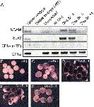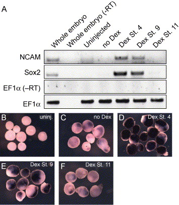 Fig. 4. Stage-dependent neural induction in isolated embryonic ectoderm. Neural induction in embryos injected with 300 pg δSmad7TEVGR and 10 pg TEV2GR was examined by RT-PCR for N-CAM or Sox-2 (A) or in situ hybridization for Sox2 (BâF). (A) Addition of DEX induces strong neural expression in caps from embryos to which DEX was added at stage 4. Neural markers are also up-regulated upon addition of DEX at stage 9, though the neural response is decreased. Neural marker expression is absent in caps to which DEX is added at stage 11. (B) Little or no Sox2 expression is observed in β-gal-injected caps or in δSmad7TEVGR/TEV2GR-injected caps to which no DEX was added (C). Caps from δSmad7TEVGR/TEV2GR-injected embryos to which DEX was added at stage 4 show strong Sox2 upregulation (D). Up-regulation of Sox2 is diminished in δSmad7TEVGR/TEV2GR-injected caps to which Dex was added at stage 9 (E), and absent upon addition of DEX at stage 11 (F). (A) This effect was also observed by RT-PCR. Little induction of the neural markers Sox2 or NCAM is observed in the absence of DEX.