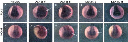 Fig. 6. Stage-dependent ectopic neural induction by δSmad7TEVGR-mediated BMP inhibition. Embryos were injected with 300 pg δSmad7TEVGR and 10 pg TEV2GR. After injection, embryos were cultured in the absence of DEX (A, F) or DEX was added at stage 6 (B, G), stage 8 (C, H), stage 9 (D, I), or stage 11 (E, J) and harvested at stage 16. Neural identity was assayed by in situ hybridization for Sox2 (AâE) or NCAM (FâJ).