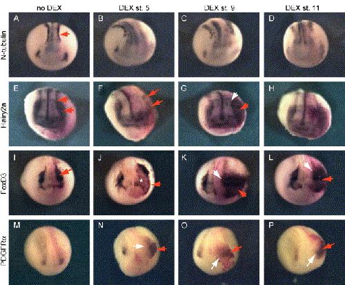 Fig. 7. Effects of δSmad7-mediated stage-dependent BMP inhibition on neural crest and neural plate border. Embryos were injected with 300 pg δSmad7TEVGR RNA and 10 pg TEV2GR RNA and cultured in the absence of DEX (A, E, I, M), or with DEX added at stage 5 (B, F, J, N), stage 9 (C, G, K, O), or stage 11 (D, H, L, P). The effects of stage-specific BMP inhibition on the neural plate border were examined by in situ hybridization for the neural border markers N-tubulin (AâD), and Hairy2a (EâH). Neural crest development was examined by in situ hybridization for Hairy2a (red arrows, EâH), FoxD3 (IâL), and PDGFRα (MâP).(For interpretation of the references to colour in this figure legend, the reader is referred to the web version of this article.)