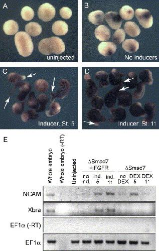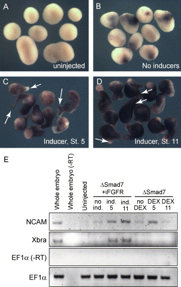 Fig. 10. FGF activation lengthens the period of neural competence in animal caps and induces expression of Xbra. Embryos were injected with 20 pg iFGFR1 and 300 pg δSmad7tevGR/10 pg TEV2GR RNA. Inducers (10 μM DEX and/or 1.25 μM AP20187) were added at stage 5 (C) or stage 11 (D). Animal caps were cut at stage 9 and collected at stage 14, when they were subjected to either to in situ hybridization for Sox2 or to RT-PCR. No Sox2 expression is detected in caps from uninjected embryos (A), and minimal Sox2 is present in caps from injected embryos to which no inducer was added (B). Strong up-regulation of Sox2 is observed in caps to which inducers were added at stage 5 (C). Addition of inducers at stage 11 also strongly activates Sox2 expression (D). This is in contrast to caps from embryos injected with δSmad7tevGR and TEV2GR and activated at stage 11 (compare with Fig. 4F). Note the elongation in caps induced at both stage 5 and stage 11 (arrows, C, D), suggesting mesoderm induction due to the activation of FGF. (F) RT-PCR for NCAM confirms the ability of iFGFR and δSmad7tevGR, but not δSmad7tevGR alone, to induce neural development when activated at stage 11. RT-PCR for Xbra further supports the induction of mesoderm in iFGFR- and δSmad7tevGR/TEV2GR-injected caps, but not in caps injected with δSmad7tevGR and TEV2GR alone.