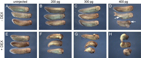 Fig. 2. Phenotypic consequences of δSmad7TEVGR/TEV2GR expression in the absence and presence of DEX. Phenotypes of uninjected embryos (A) or embryos injected with 200 pg (B), 300 pg (C) or 400 pg (D) δSmad7TEVGR mRNA together with 10 pg TEV2GR mRNA. Note the head defects and partial duplication of axes at the highest concentration of δSmad7TEVGR (arrows, D). In the presence of 10 μM DEX, uninjected embryos are phenotypically normal (E), but injected embryos show defects reflecting dorsalization of the embryo (FâH).