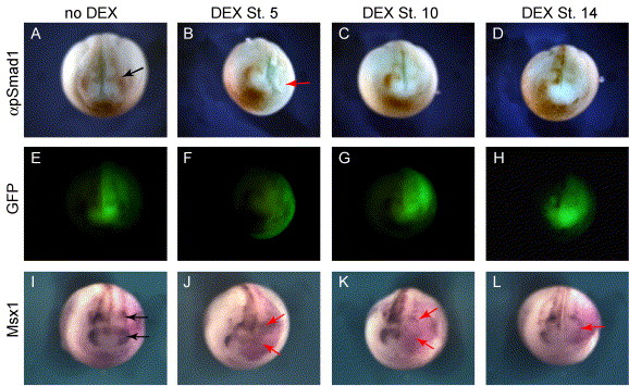 Fig. 5. DEX-dependent inhibition of pSmad1 and of the BMP transcriptional target Msx1. mRNA encoding δSmad7-3TEVGR (300 pg) and TEV2GR (10 pg) were injected into 1 cell of 2-cell stage embryos. To mark the injected side, mRNA encoding either GFP (AâH) or β-galactosidase (IâL) was also included. 10 μM DEX was added at either St. 5, St. 10, or St. 14, with control embryos cultured in the absence of DEX. When DEX is added, inhibition of Smad1 phosphorylation on the injected side is observed by anti-phosphoSmad1 immunostaining (BâD) and by in situ hybridization for Msx1, a transcriptional target of BMP signaling (JâK). Little or no effect is observed on either of these markers in controls where no DEX is added (A, I).