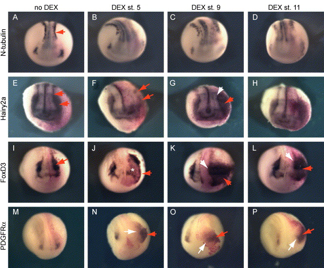 Fig. 7. Effects of δSmad7-mediated stage-dependent BMP inhibition on neural crest and neural plate border. Embryos were injected with 300 pg δSmad7TEVGR RNA and 10 pg TEV2GR RNA and cultured in the absence of DEX (A, E, I, M), or with DEX added at stage 5 (B, F, J, N), stage 9 (C, G, K, O), or stage 11 (D, H, L, P). The effects of stage-specific BMP inhibition on the neural plate border were examined by in situ hybridization for the neural border markers N-tubulin (AâD), and Hairy2a (EâH). Neural crest development was examined by in situ hybridization for Hairy2a (red arrows, EâH), FoxD3 (IâL), and PDGFRα (MâP).(For interpretation of the references to colour in this figure legend, the reader is referred to the web version of this article.)