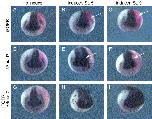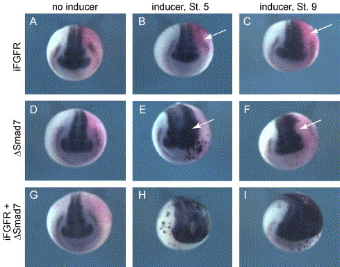 Fig. 8. FGF activation must be combined with BMP inhibition to induce ectopic neural expression during gastrulation. Embryos were injected with 20 pg iFGFR1 RNA (A–C), 300 pg δSmad7TEVGR and 10 pg TEV2GR RNA (D–F), or 20 pg iFGFR1 + 300 pg δSmad7TEVGR/10 pg TEV2GR RNA (G–I). Inducer (10 μM DEX and/or 1.25 μM AP20187) was added at stage 5 (B, E, H) or stage 9 (C, F, I). In the absence of inducer, ectopic neural induction is not observed in injected embryos (A, D, G). No ectopic neural induction is observed on the injected side (arrows) in iFGFR1-injected embryos when AP20187 is added at stage 5 (B) or stage 9 (C). Ectopic neural induction is observed in δSmad7TEVGR/TEV2GR-injected embryos upon addition of DEX at stage 5 (arrow, E), but induction is minimal when DEX is added at stage 9 (arrow, F). FGF activation and BMP inhibition appear to act synergistically, as strong ectopic neural induction is observed when iFGFR and δSmad7TEVGR/TEV2GR are combined, both when inducer is added at stage 5 (H) or at stage 9 (I).