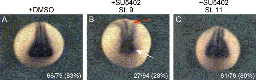 Fig. 9. Inhibition of FGF signaling reduces the size of the neural plate. Embryos were cultured in 0.1à MMR with either 0.005% DMSO (A) or 20 μM SU5402 + 0.005% DMSO added at stage 9 (B) or stage 11 (C). Neural plate formation was examined by in situ hybridization for Sox2. (A) Control embryos treated with DMSO exhibit normal neural plates (66/79 normal). (B) Addition of SU5402 at stage 9 causes spina bifida (red arrow) and reduction of the anterior neural plate (white arrow). Only 27/94 embryos examined exhibited normal-sized anterior neural plates. (C) 61/76 embryos to which SU5402 was added at stage 11 exhibit normal-sized neural plates. Spina bifida is absent in most embryos.(For interpretation of the references to colour in this figure legend, the reader is referred to the web version of this article.)