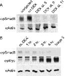 Fig. 3. Inhibition of pSmad1 occurs rapidly after DEX addition. (A) RNA was into both cells of two-cell stage embryos, animal cap explants were isolated at stage 8 and DEX was added when sibling embryos were at either stage 9 or stage 11. The caps were then allowed to develop overnight at 14°C, until sibling embryos had reached stage 16, when they were harvested and phosphoSmad1 levels were analyzed by Western blot. (B) mRNA encoding 300 pg δSmad73TEVGR and 10 pg TEV2GR was injected into both cells at the two-cell stage. Animal caps were isolated and assayed by Western blot with anti-phosphoSmad1 antibody. Cytoskeletal actin was used as a loading control. Culture of embryos and caps was carried out at 14°C. DEX was added either before caps were cut (St. 5) or 6, 3, 2, and 1 h before harvesting at stage 10. One hour after DEX addition, pSmad1 inhibition is substantially inhibited. By 3 h after addition, pSmad1 levels are equivalent to that observed in caps from embryos to which DEX was added at stage 5.