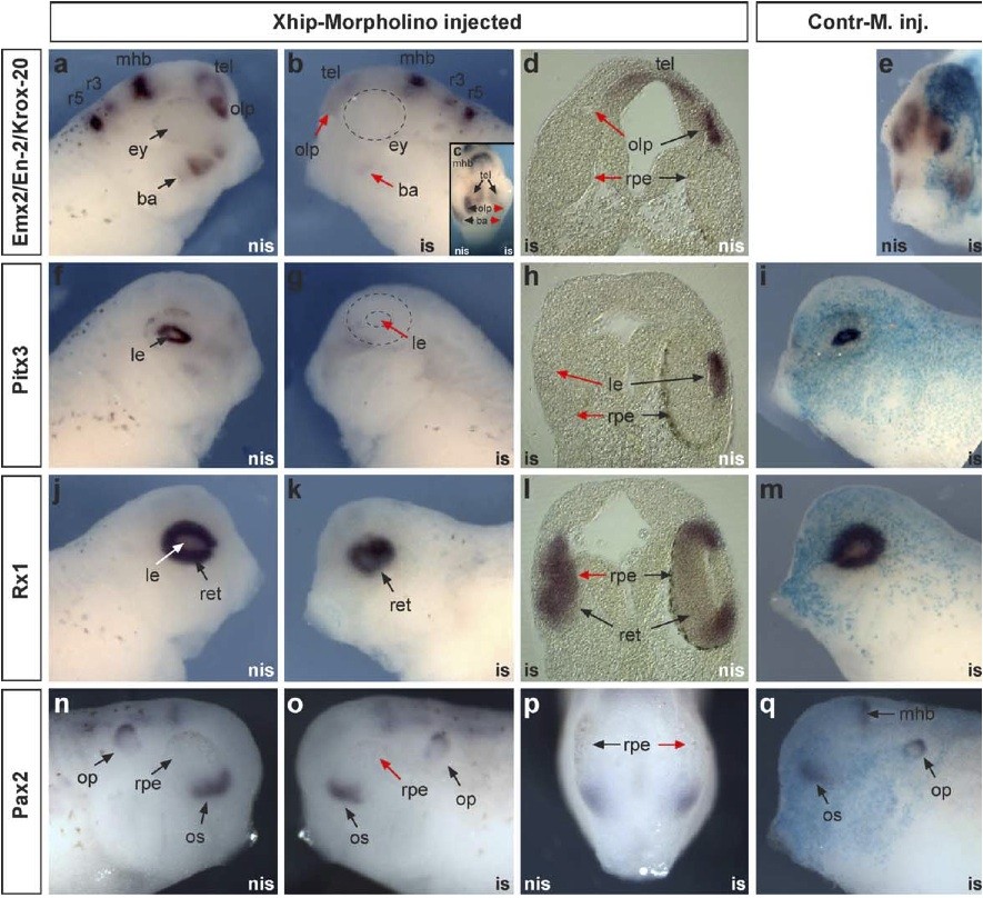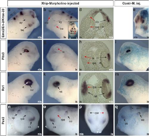 Fig. 7. Suppression of Xhip function by antisense-morpholino injection resulted in loss of lens and olfactory placode formation. Whole mount in situ hybridization of Xhip-morpholino (a, f, j, n) and control-morpholino (e, i, m, q) injected embryos at NF stage 36. (a, f, j, n) Lateral anterior view of the non-injected side. (c, e) Frontal view, injected side to the right. (d, h, l) Horizontal vibratome sections of the corresponding embryos. In control-morpholino (5 pmol) injected embryos LacZ mRNA was co-injected as a lineage tracer (light blue). (a) Expression of Krox-20, En-2 and Emx2 was detected simultaneously. (b, c, d) Xhip-morpholino injection into one cell of a two cell-stage embryo (2.5 pmol/blastomere) did suppress the expression of Emx2 in the olfactory placode and branchial arches (74%, n = 31; red arrows), and that of Xpitx3 in the lens ectoderm (65%, n = 40; red arrow in g, h). (k, l) The expression level of Rx1 in the remaining eye cup was not altered, although the morphology of the eye cup was perturbed and the retinal pigment epithelium was not formed (68%, n = 38; d, h, l). (n) Xhip-morpholino injection did not suppress otic vesicle formation as shown by Pax2 expression, but RPE formation (100%, n = 47; red arrows in o, p). (r) Increasing amounts of mHip1 mRNA (50 or 100 pg) injected together with Xhip morpholino rescued the formation of lens and olfactory placodes. (s) Summary diagram of interactions of Hip, Hh, Wnt-8, Fgf-8 and activin. The arrows do not suggest direct interactions; for details, see Discussion. Abbreviations: ba, branchial arches; ey, eye; is, injected site; le, lens; mhb, midbrainindbrain boundary; nis, non-injected side; olp, olfactory placode; op, otic vesicle; os, optic stalk; r3/5, rhombomere 3/5; ret, retina; rpe, retinal pigment epithelium; tel, telencephalon. |