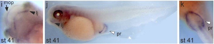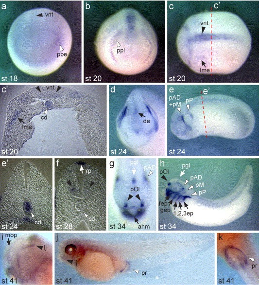 Fig. 2. Temporal and spatial expression of Xhip. Whole mount in situ hybridization of Xhip in Xenopus embryos. Staging according to Nieuwkoop and Faber (1967). (a) Neurula stage (NF stage 18), anterior view. White arrowhead, preplacodal ectoderm; black arrowhead, expression of Xhip in paraxial stripes in the ventral neural tube. (b) Early tailbud (NF stage 20), frontal view. Arrowhead, presumptive placodal epithelium. (c) Dorsal view, anterior to the left. Arrow, lateral mesoderm; arrowhead, ventral neural tube. (câ²) Transversal section. White arrowhead, chorda dorsalis; arrow, lateral mesoderm; black arrowheads, paraxial stripes in the ventral neural tube. (d) Mid-tailbud (NF stage 24), frontal view. Arrow, diencephalon. (e) Lateral view, anterior to the left. White arrowhead, pAD + pM, common anterodorsal and middle lateral line placode; white arrowhead, pP, posterior lateral line placode. (câ², eâ², f) Transversal sections reveal Xhip expression in the chorda dorsalis at NF stages 18 and 24, but not at NF stage 28 (white arrowheads). (f) Expression of Xhip in the roof plate (white arrow), Xhip dorsal to the floor plate (black arrowhead). (g) In tailtip stage embryos (NF stage 34), frontal view, Xhip is expressed in the pineal gland (white arrow), in the anterodorsal lateral line placode (white arrowhead), in the olfactory placodes (black arrowhead) and in the anterior head mesenchyme (black arrow). (h) Lateral view, anterior to the left. A black arrowhead indicates Xhip expression in the olfactory placode. White arrow, pineal gland anlage. White arrowheads, anterodorsal, middle and posterior lateral line placode; black arrows from anterior to posterior, facial epibranchial placode fused with the anteroventral lateral line placode, glossopharyngeal placode, 1st, 2nd, and 3rd vagal epibranchial placode. (i) Ventral view of the head of the tadpole shown in j (NF stage 41); arrowhead, lower jaw; arrow, rim of the mouth opening. (j) Lateral view, anterior to the left. Black arrowhead, lower jaw; white arrowhead, rim-like staining for Xhip at the transition zone between the yolk mass and the ectoderm. (k) Ventral view of the proctodeum of the tadpole shown in j, white arrowhead as in j. Abbreviations: 1,2,3ep, 1st, 2nd, and 3rd vagal epibranchial placode; ahm, anterior head mesenchyme; cd, chorda dorsalis; de, diencephalon; fep, facial epibranchial placode fused with the anteroventral lateral line placode; gep, glossopharyngeal placode; mop, mouth opening; lj, lower jaw; lme, lateral mesoderm; pAD, anterodorsal lateral line placode; pgl, pineal gland; pM, middle lateral line placode; pOl, olfactory placode; pP, posterior lateral line placode; ppe, preplacodal ectoderm; ppl, presumptive placodal epithelium; pr, proctodeum; rp, roof plate; vnt, ventral neural tube. |