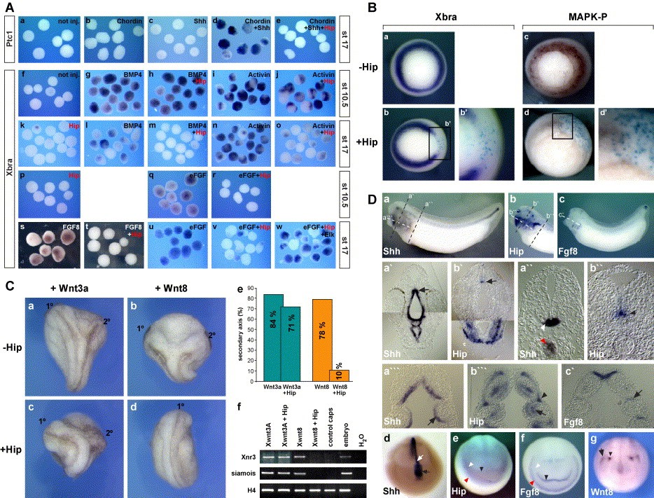 Fig. 4. Hip as multifunctional antagonist of Shh, eFgf/Fgf-8 and Wnt-8 signaling pathways. (A) mHip1 inhibits Shh and eFgf pathways in animal cap explants. (aâe) Explants corresponding to NF stage 17. In situ hybridization with Ptc1 as a marker for active Shh signaling. (a, b, c) Control caps and caps either injected with Chordin (50 pg) or Shh (500 pg) mRNA do not express Ptc1. (d) Co-injection of Chordin and Shh mRNA (500 pg) induces Ptc1. (e) mHip1 mRNA (1 ng) suppresses Ptc1 induced by Chordin and Shh. (fâw) Explants stained for Xbra at NF stage 10.5 or stage 17, respectively. (f) Control caps and caps injected with mHip1 mRNA (k, p) do not express Xbra. (g, l) Xbra expression induced by BMP4 mRNA (1 ng) or by activin mRNA (5 pg; i, n) is not blocked by mHip1 in early explants (h, j) but in late explants (m, o). The induction of Xbra by either eFgf mRNA (10 pg; q, u) or Fgf-8 (150 pg; s) is inhibited by the co-injection of mHip1 (r, t, v), but Xbra expression is rescued by Elk mRNA (w, 300 pg). (B) (aâdâ²) Early gastrula stage embryos (NF stage 10), vegetal view. (a, b, bâ²) Xbra in situ hybridization and (c, d, dâ²) immunostaining of phosphorylated MAPK (MAPK-P). (a, c) Control embryos, Xbra and MAPK-P staining around the blastopore. Microinjection of mHip1 mRNA (750 pg) into one cell of a four cell stage embryo inhibits expression of Xbra (b, bâ²; 72%, n = 25) and phosphorylation of MAPK (d, dâ²; 67%, n = 15). LacZ mRNA was co-injected as a lineage tracer (light blue). (C) (a, b, e) Second axis formation induced by Wnt-3a (a; 0.5 pg; 84% 2° axis; n = 57) or Wnt-8 mRNA (b; 5 pg; 78% 2° axis, n = 49). Co-injection of mHip1 (600 pg) did not block Wnt-3a (c; 71% 2° axis; n = 32), but Wnt-8 activities (d; 10% 2° axis, n = 39). RT-PCR analysis of animal caps at NF stage 10.5. (f) Induction of Xnr3 and siamois by Wnt-8 (50 pg), but not by Wnt-3a (e; 0.5 pg), was inhibited by mHip1. (D) Comparison of Xhip, Shh, Fgf-8, and Wnt-8 expression. (a, b, c) Lateral views, anterior to the left. (aâ², aâ², bâ², bâ²) Transversal sections. Shh expression in the ventricular layer of the ventral diencephalon (arrow), while Xhip expression was detected near the sulcus limitans (arrow) in early tadpoles. (aâ²) Shh expression was found in the chorda dorsalis (red arrowhead) and floorplate (white arrowhead) and (bâ²) Xhip transcripts only dorsally to the floorplate (black arrowhead). (a, b, câ²) Horizontal sections, anterior up. (a) Shh transcripts were detected in the posterior endothelium of the endodermal visceral pouches (black arrow) and Fgf-8 in the anterior endothelium (câ², black arrow), whereas (b) Xhip expression was detected in the adjacent mesenchyme of the branchial arches (arrow). (d, e, f, g) Anterior view of neurula stage embryos. (d) Cleared embryo. Shh transcripts in the chorda dorsalis (white arrow) and prechordal plate (black arrow). (e, f) Xhip expression in the preplacodal region (white arrowhead) limited by Fgf-8 transcripts in the anterior neural ridge (black arrowhead) and in a line outside the neural plate (red arrowhead). (g) Xhip in the lateral placodes is juxtaposed toward Wnt-8 positive cells (arrow, arrowhead). |