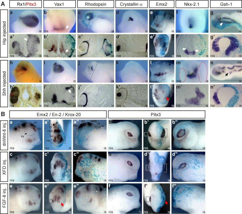 Fig. 5. The inhibition of Shh, Fgf and Wnt-8 signaling affects eye, brain, and placode development in tadpole stage embryos. (A) Overexpression of mHip1 and Shh. (aâgâ²) Microinjection of mHip1 (750 pg) into one cell of two-cell stage embryos. (hânâ²) Overexpression of Shh (500 pg) into one cell of two-cell stage embryos. (b, eâ², f, lâ², m) Frontal view. (a, c, d, e, h, i, j, k, l) Lateral view. (g, n) Dorsal view. (aâ²âdâ², fâ², gâ², hâ²âkâ², mâ², nâ²) Transversal sections. (a, aâ²) Formation of a giant eye. Note Xrx1-positive cells extend into the prospective midbrain region (white arrow in aâ², 67%, n = 18). (b, bâ²) Repression of optic stalk marker Vax1 within the ventral fore- and midbrain (white arrows, 63%, n = 28). (c, câ²) Displaced Rhodopsin positive cells in the enlarged eye (76%, n = 21). (d, dâ²) Abnormal lens formation revealed by Crystallin α expression (50%, n = 12). (e, eâ²) Enlarged olfactory placode as revealed by Emx2 expression, indicated by dashed open rectangles (65%, n = 17). (f, fâ²) Ventral shift of the dorsal limit of Nkx-2.1 expression (white arrows in fâ², 55%, n = 11). (g, gâ²) Ventral expansion of Gsh-1 expression (38%, n = 8). (hâhâ²) Note the reduction of retinal tissue (Xrx1, dark brown) and lens tissue (Pitx3, red, 50%, n = 10). (i, iâ²) Expanded expression domain of the optic stalk marker Vax1 (white arrow in iâ², 62%, n = 13). (j, jâ²) Loss of Rhodopsin positive cells (83%, n = 16). (k, kâ²) Absence of lens specific Crystallin α expression (57%, n = 14). (l, lâ²) Suppression of olfactory placode development as revealed by the loss of Emx2 expression, indicated by a red arrow (65%, n = 17). The dashed open rectangle marks the olfactory placode on the non-injected side (lâ²). (m, mâ²) Dorsal shift of ventral forebrain tissue as revealed by Nkx-2.1 expression (56%, n = 16), the eye structures are emphasized by dashed ellipses. (n, nâ²) Reduced expression of the dorsal neural tube marker Gsh-1 in the prospective midbrain (black arrow, 42%, n = 12). LacZ mRNA was co-injected as a lineage tracer (light blue in bâ², c, câ², e, eâ², fâ², g, gâ², l, lâ², nâ²). (B) Influence of dnWnt-8, XFD and Fgf-8 overexpression on lens and olfactory placode development. (aâ², bâ², câ², dâ², eâ², fâ²) Frontal views, dashed open rectangles indicate the size of the olfactory and lens placodes, respectively. (a, aâ², b, bâ², c, câ², d, dâ², e, eâ², f, fâ²) Lateral views. (aâbâ²) Overexpression of dnWnt-8 (500 pg) resulted in enlarged olfactory (Emx2; 76%, n = 22) and lens placodes (Pitx3; 78%, n = 18). (câdâ²) XFD (1 ng) injection did not alter the size of the olfactory placode but led to enlarged lens placodes (83%, n = 16). (eâfâ²) Additional Fgf-8 (10 pg) inhibits olfactory and lens placode induction (red arrows in eâ² and fâ²; 76%, n = 19). (aâaâ², câcâ², eâeâ²) Krox-20 and En-2 expression was followed to control hindbrain and midbrainâhindbrain formation, respectively. LacZ mRNA was co-injected as a lineage tracer (light blue in aâ², aâ², bâ², bâ², câ², câ², dâ², dâ², eâ², eâ², fâ², fâ²). Abbreviations: ey, eye cup; mhb, midbrainâhindbrain boundary; olp, olfactory placode; r3, rhombomere 3; r5, rhombomere 5; tel, telencephalon. |