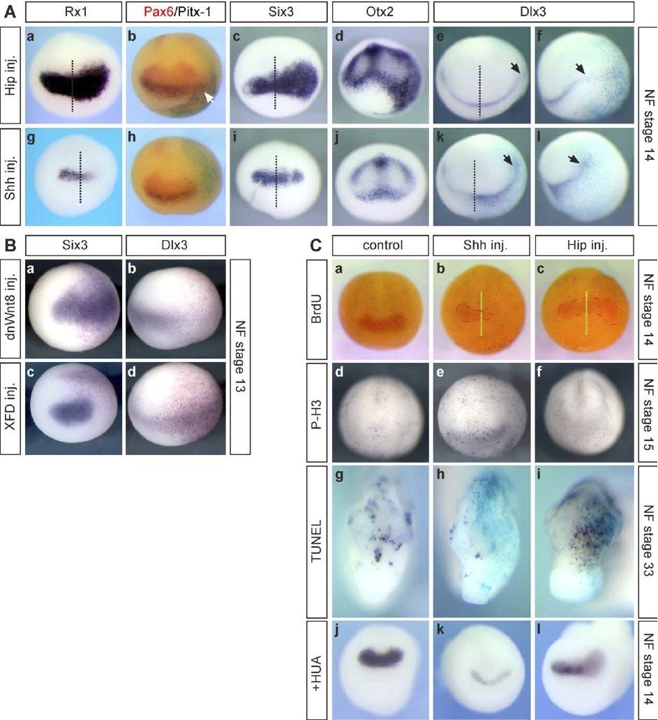 Fig. 6. Regulation of early eye field formation by Hip and Shh. (A) (a, g) Frontal views of embryos at NF stage 14, injected side to the right. (f, l) Lateral views of e and k. (a) Increased number of retinal progenitors upon mHip1 overexpression (750 pg; 71%, n = 46). (g) Reduction of Xrx1 expression after injection of Shh (500 pg; 50%, n = 32). (b, h) While Shh overexpression results in a slight reduction of Pax6 expression in the anterior neural plate and Pitx1 expression in the early lens field (45%, n = 11), both genes are up-regulated and expanded laterally after mHip1 injection (67%, n = 9). Microinjection of mHip1 mRNA results in strongly expanded domains of Six3 and Otx2 (c, 60%, n = 10; d, 100%, n = 8), but are almost normal upon Shh overexpression (i, 23%, n = 13; j, 67%, n = 12). (e, f) Overexpression of mHip1 results in reduction and lateral shift of Dlx3 (black arrows, 43%, n = 14). (k, l) Expression of Dlx3 in ectoderm surrounding the neural plate is increased after Shh injection (black arrows, 36%, n = 14). (B) (a) Frontal views of embryos at NF stage 13, injected side to the right. (a) Strong activation of Six3 upon injection of dnWnt-8 mRNA (63%, n = 11), while Dlx3 expression is reduced (b, 58%, n = 12). XFD overexpression did not alter Six3 (c, 95%, n = 9) or Dlx3 (d, 100%, n = 8) expression significantly. LacZ mRNA was co-injected and visualized by red- gal stain. (C) (a) BrdU-proliferation assay and (d) phospho-histone H3-proliferation assay. Frontal views of embryos at NF stages 14 and 15, respectively. mHip1 and Shh mRNA was injected into one cell of a two-cell stage embryo, injected side to the right. (b, c) Rx1 expression (red) was monitored to visualize mHip1 and Shh activity (indicated by dashed line). (b, e) The number of BrdU- and p-H3-positive cells is slightly enhanced by Shh and reduced upon mHip1 overexpression (c, f) versus control embryos (a, d). (g) Frontal views of tailbud embryos at NF stage 33 after TUNEL staining. (h) Shh overexpression reduces cell death, whereas the number of apoptotic cells is increased upon mHip1 injection (i). LacZ mRNA was co-injected as a lineage tracer (light blue). (jl) Mitotic arrest assay. (j) Control embryo, showing that normal Rx1 expression is maintained after HUA treatment. (i) mHip1 injection still expands the retinal territory (71%, n = 34), whereas in Shh injected embryos Rx1 expression is reduced (k). |