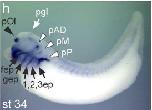 hhip <hedgehog interacting protein> gene expression in Xenopus laevis embryo via in situ hybridization, NF stage 34, anterior view, dorsal top. Image published in: Cornesse Y et al. (2005) |