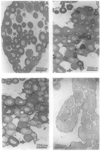 FIG. 4. Variation in protein concentration as a function of oocyte diameter. (A) Densitometric recording of the ovary sections stained with