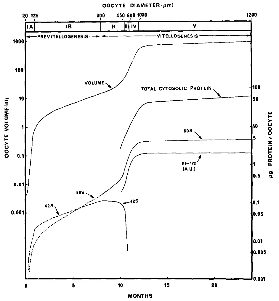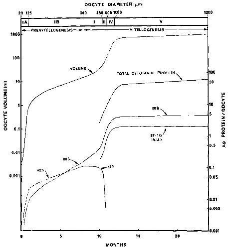 FIG. 5. Time course of protein accumulation during oogenesis of X laevis. The time intervals are taken from Callen et al. (1980a, b). Roman