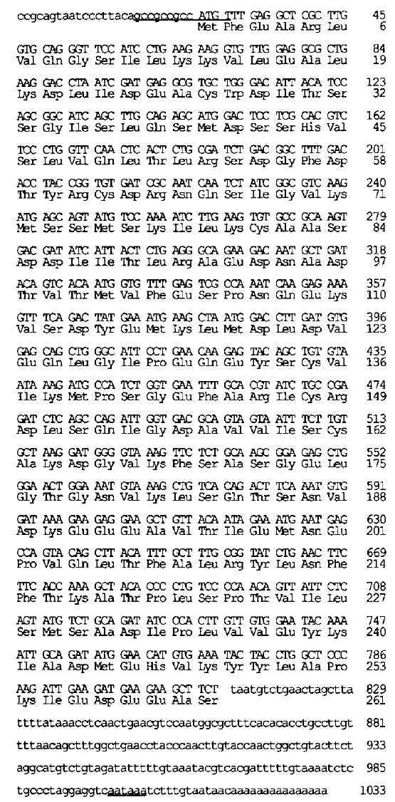 Fig. 1. DNA sequence and predicted amino acid sequence of the 1033-bp cDNA Xenopus laevis PCNA clone. Nucleotides are numbered in the 5' to 3' direction. The AATAAA polyadenylation signal and the consensus initiator sequence are underlined.