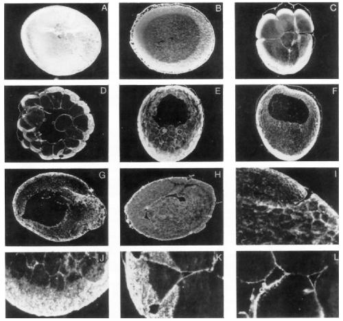 (J) detail of E, stage 7 blastula; (K) detail of D, stage 6 embryo; (L) detail of stage 8, mid-blastula embryo.