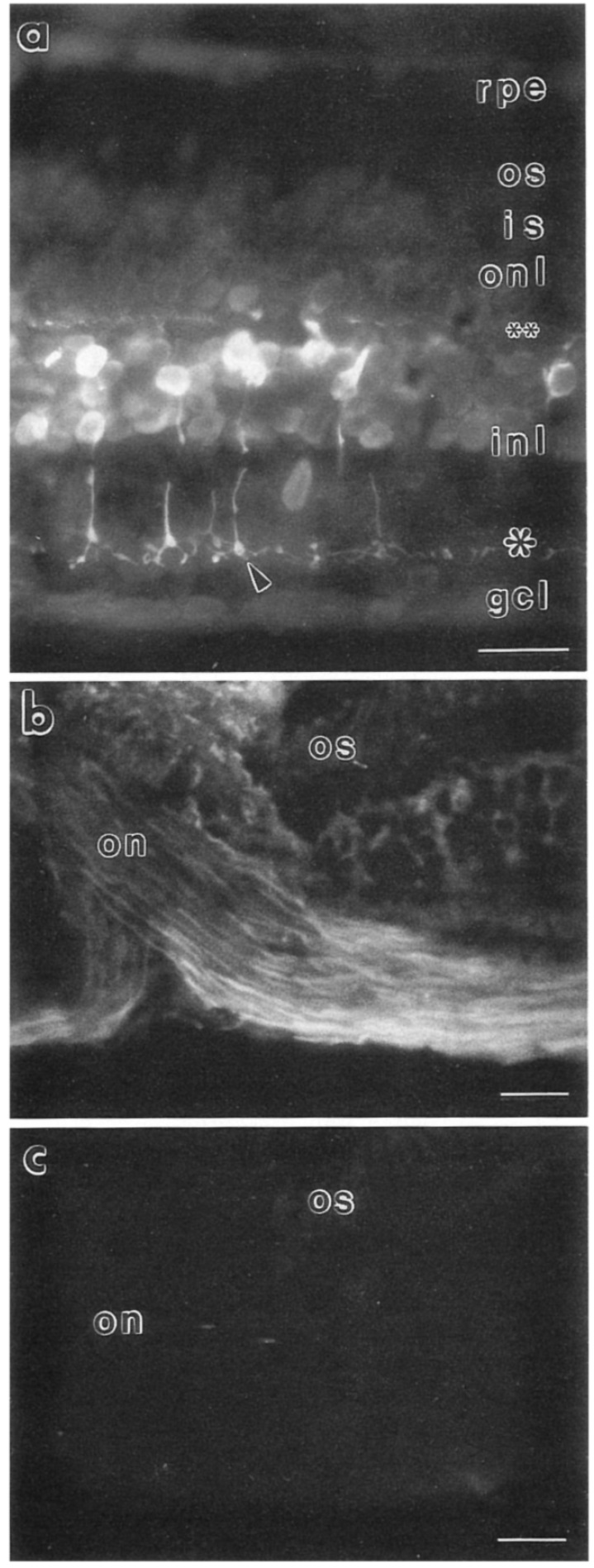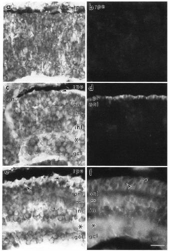 (large arrowhead) or the outer nuclear layer. Diffuse label is seen in the inner plexiform (large asterisk) and ganglion cell layers. (a-f) Bar, 20